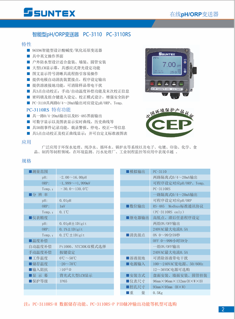 suntexRS-485 Modbus通讯协议PH计PC-3110RS/SenTix XO,青岛春阳电子有限公司提供的工业在线ph计特性: